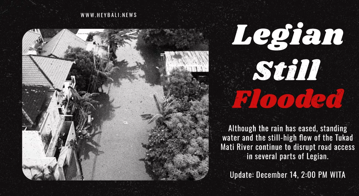 LEGIAN — Rainfall across Legian had eased by early afternoon on Sunday, but flood risks have not fully subsided. As of 2:00 PM local time, water levels in Tukad Mati River remain relatively high, keeping several surrounding streets partially inundated and traffic conditions fragile.