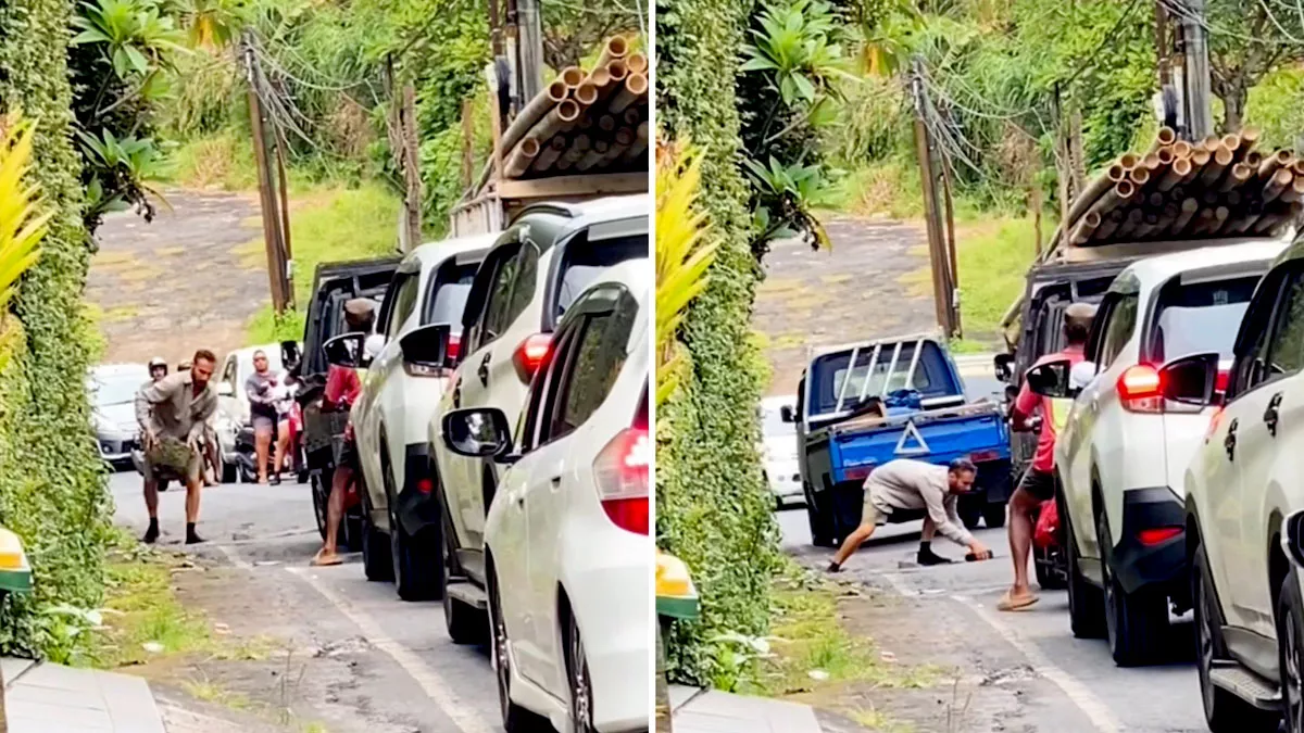 A video circulating online shows a man, identified as a foreign national, carefully placing rocks into and around a significant pothole on a road in Lodtunduh, Ubud.