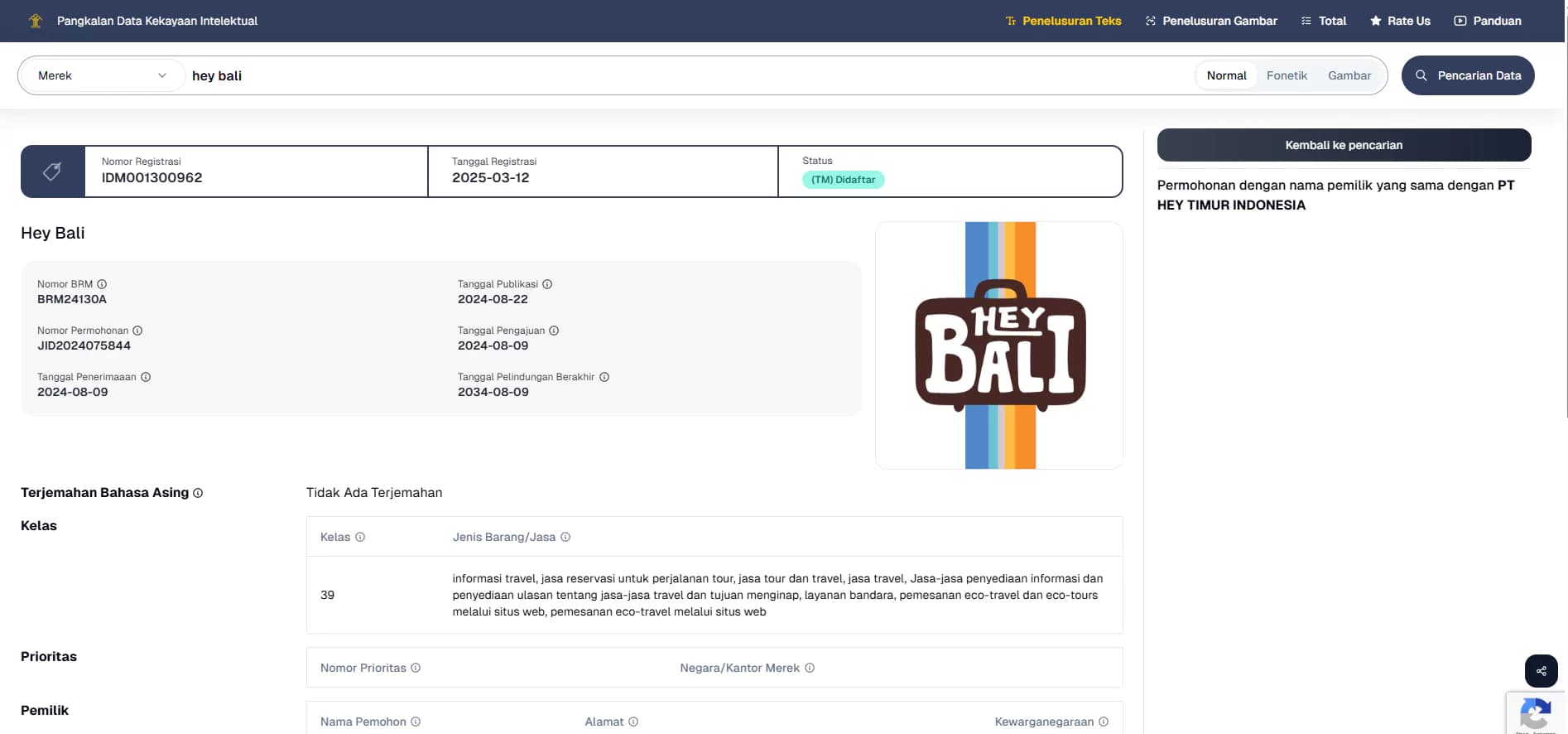 By being officially registered in the Indonesian Intellectual Property Database, Hey Bali secures exclusive rights in the fields of travel information, tour reservation services, tour and travel services, airport services, eco-travel booking, and destination reviews. This also confirms that Hey Bali is a legitimate, trusted, and fully legal brand in the Indonesian travel industry.