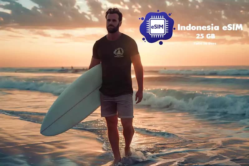 The eSIM provides 24 GB of data—20.5 GB for Bali and Lombok, plus 3.5 GB for use across Indonesia, valid for 30 days.